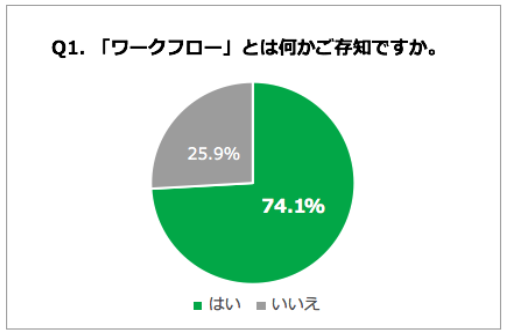 「Q1. ワークフローとは何かご存知ですか。」(n=108)と質問したところ、「はい」と答えた会社員が74.1%と、多く会社員がワークフローについて認知していることがわかりました。