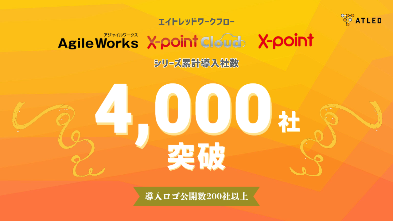 業務手続きの電子化(ワークフローシステム)大手の株式会社エイトレッド(本社:東京都渋谷区、代表取締役社長:岡本 康広 以下、エイトレッド)が開発・提供するワークフローシステム「AgileWorks(アジャイルワークス)」および「X-point(エクスポイント)」、ワークフロークラウド「X-point Cloud(エクスポイント クラウド)」の導入社数が、2022年10月時点で4,000社を突破したことをお知らせいたします。