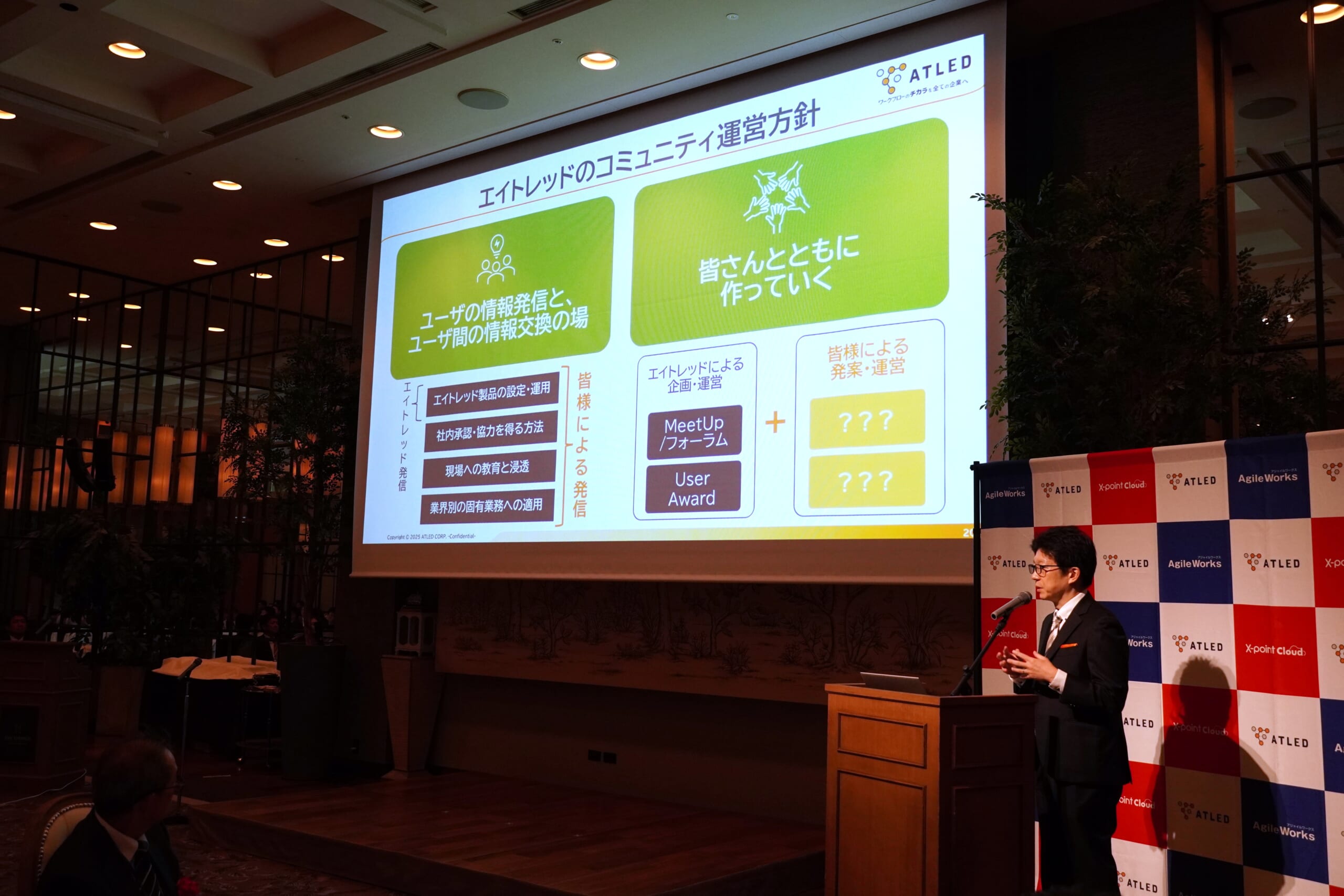 続いて、取締役プロダクト開発カスタマーサクセス部長の佐藤によるエイトレッドの今後のCX方針についてのセッションでは、業種別MeetUpの企画やコミュニティの活発化といった、ユーザーの皆様同士をつなげる支援をさらに強化していくことをお約束したほか、「AgileWorks」「X-point Cloud」の今後の製品開発方針や、“人とAIの協力を描くワークフロー”といった将来ビジョンを共有させていただきました。
