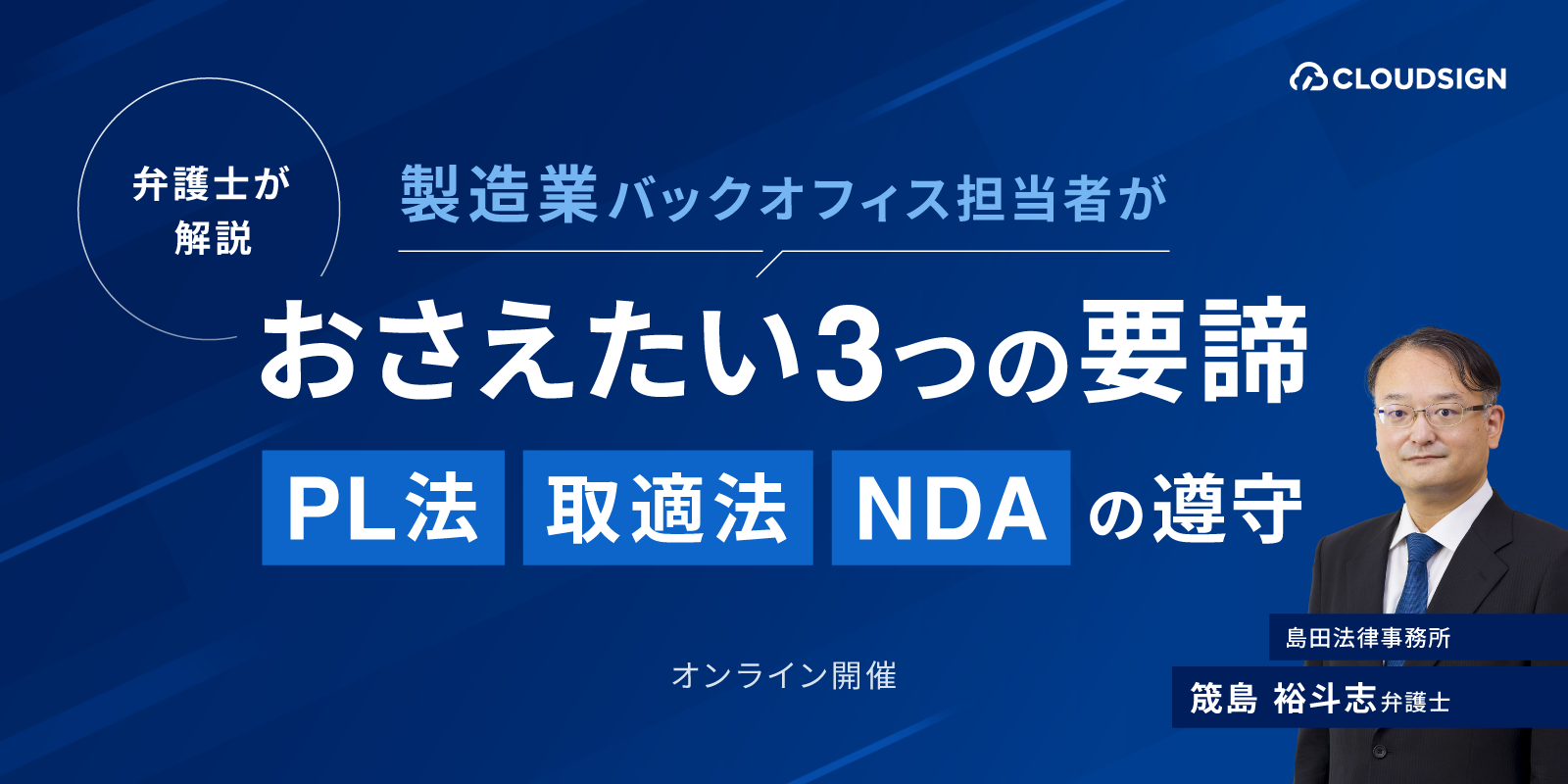 本セミナーでは、複数の著書を執筆してこられた弁護士の筬島先生をお招きし、特にリスクが高く、実務対応が求められるPL法(製造物責任法)、取適法(旧:下請法)、NDAの3点に焦点を当てて徹底解説します。