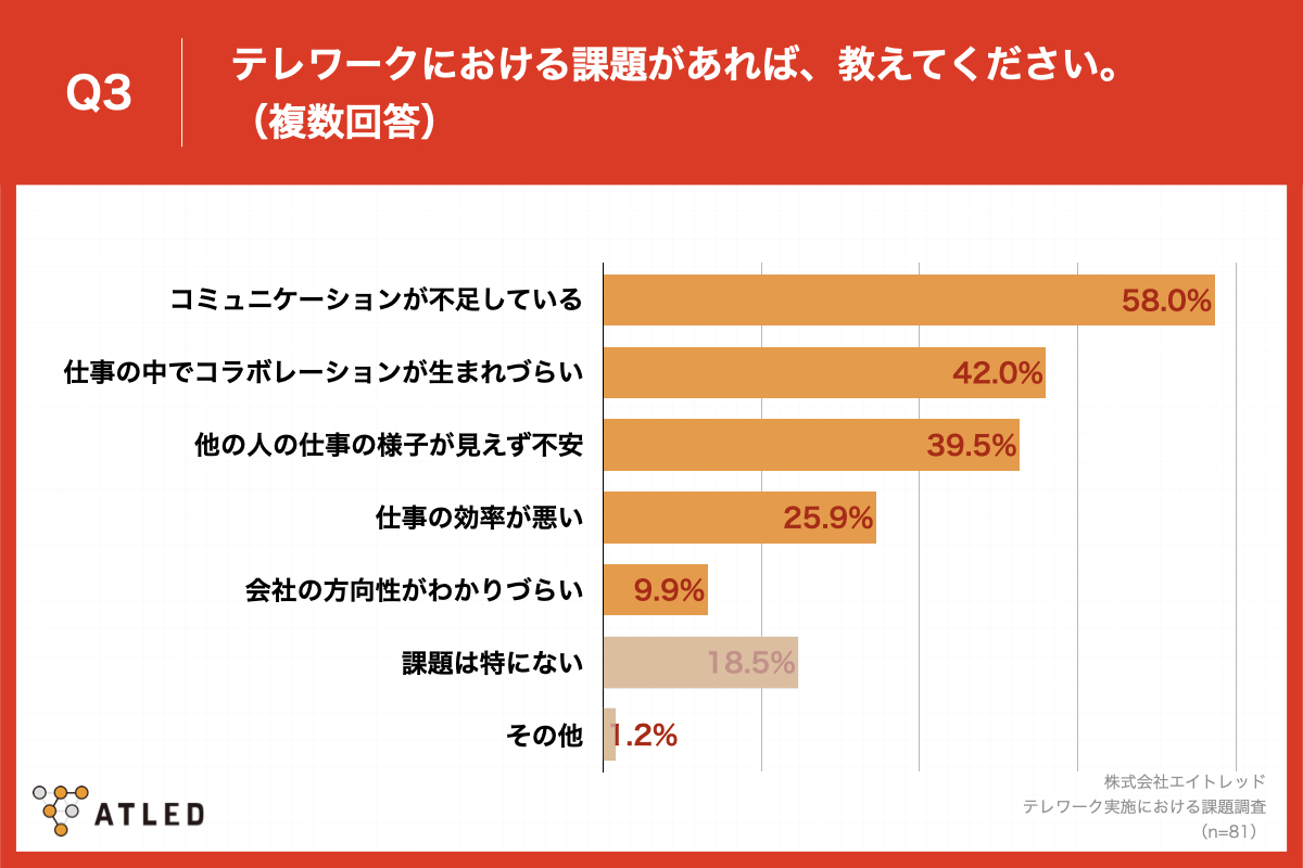 Q1で「テレワークを行っている」と回答した方に「Q3.テレワークにおける課題があれば、教えてください。(複数回答)」(n=81)と質問したところ、「コミュニケーションが不足している」が58.0%、「仕事の中でコラボレーションが生まれづらい」が42.0%、「他の人の仕事の様子が見えず不安」が39.5%という回答となりました。
