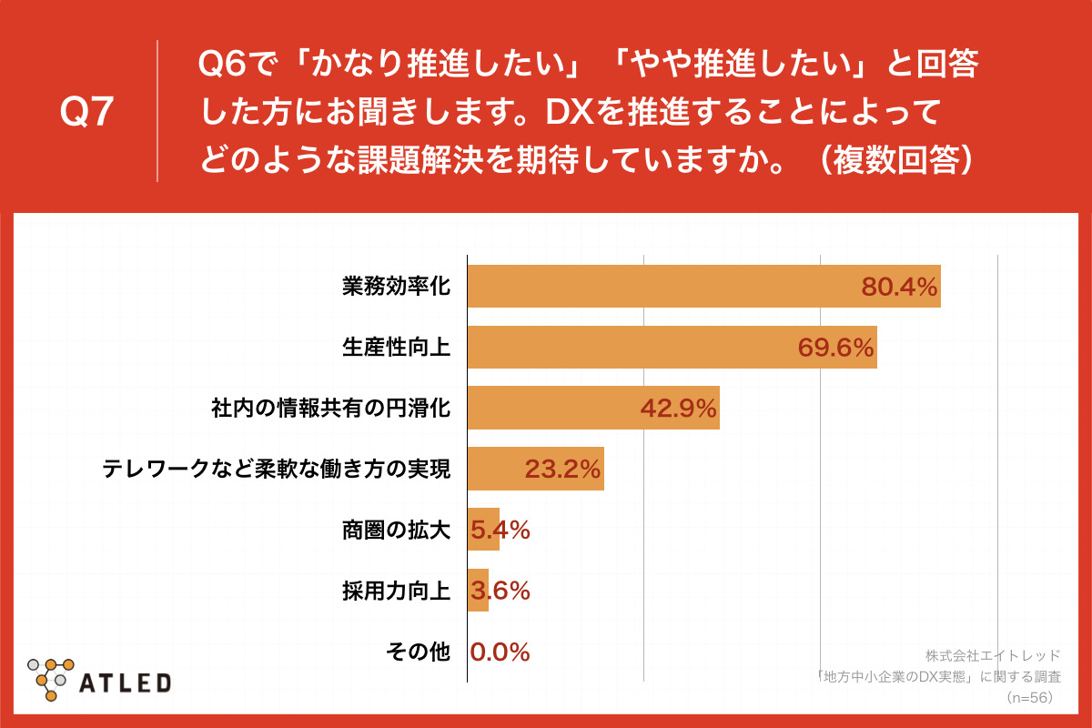 また、DXで期待していることは、「業務効率化」が80.4%、「生産性向上」が69.6%、と東京と同じ回答が上位に並んだものの、「商圏の拡大」に関しては、東京の約1/4という結果になっています。