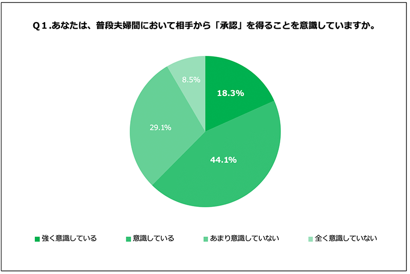 「Q1. あなたは、普段夫婦間において相手から「承認」を得ることを意識していますか。」(n=213)と質問したところ、「強く意識している」が18.3%、「意識している」が44.1%という回答となりました。