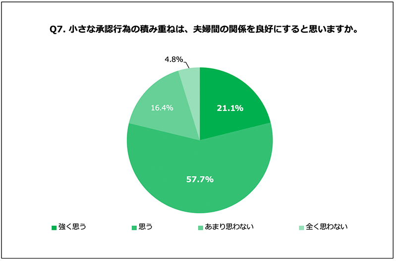 「Q7. 小さな承認行為の積み重ねは、夫婦間の関係を良好にすると思いますか。」(n=213)と質問したところ、「強く思う」が21.1%、「思う」が57.7%という回答になりました。