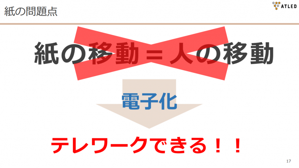 紙の移動=人の移動をなくし、うまく活用することで“100%”テレワークを実現することも期待できます。