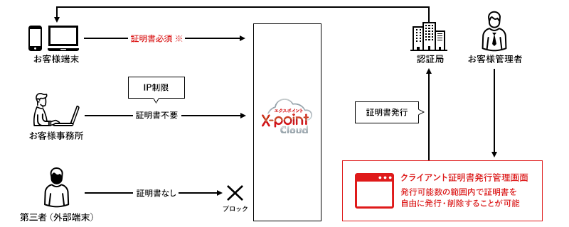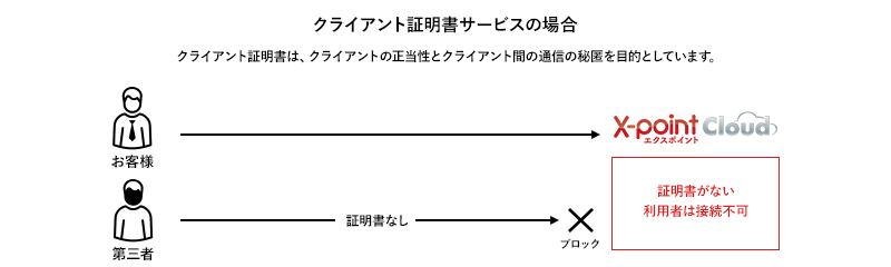 クライアント証明書サービスは、X-point Cloudをより安全にご利用いただくためのサービスです。